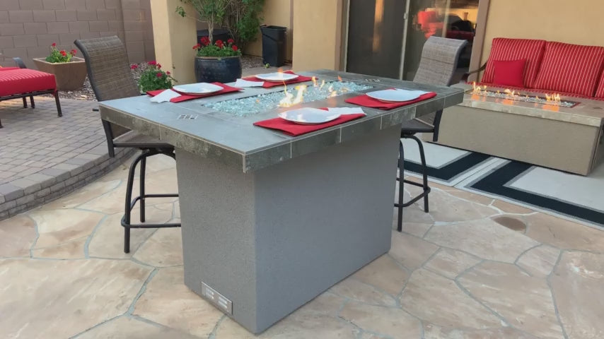 Entertainer Bar Table With Firepit. This Outdoor Kitchen Fire-table will accommodate up to 6 people. This model can be ran off of a Propane bottle or hooked up directly to Natural Gas. Built using metal studs, concrete board, porcelain tile, and synthetic stucco. This Firepit has a regulated flame that is controlled with a hearth turn key ball valve. This model will arrive fully assembled just plug and play your gas lines. Fireglass is used to cover the burner and create a cool look with style.
